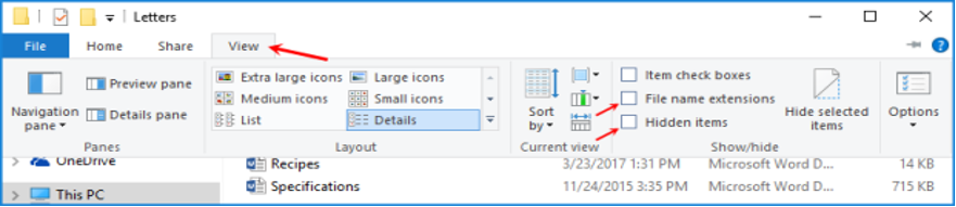 On Windows 10, you need to make changes to see file extensions by revealing “hidden items”.