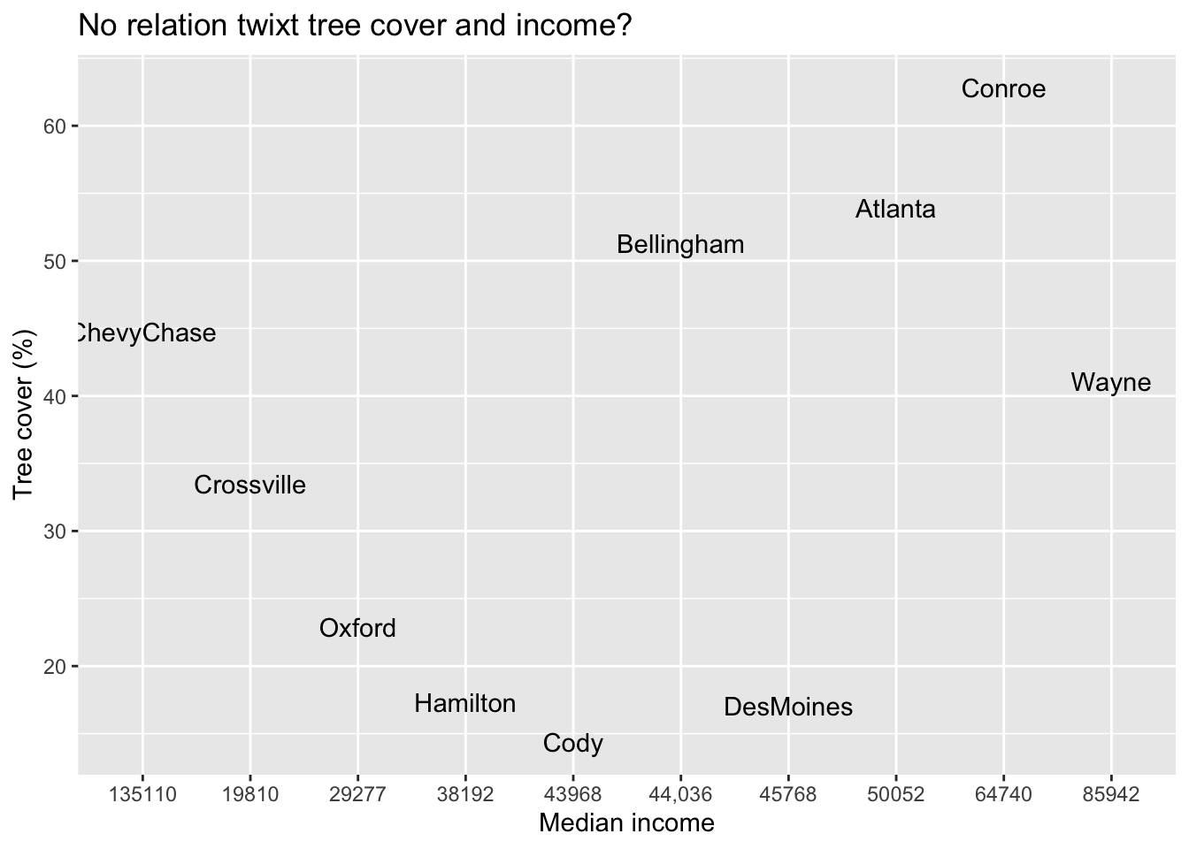 # Uncomment to show us the names of the variables# names(d)# make a scatterplotplot1 <-ggplot(data=d, aes(x=Median_Income, y=Tree_canopy_cover, label=`City (only)`)) +geom_text() +labs(y="Tree cover (%)", x="Median income", title="No relation twixt tree cover and income?")ggsave("myCoverIncome_text.png", plot=plot1, width=10, height =10)plot2 <-ggplot(data=d, aes(x=Median_Income, y=Tree_canopy_cover, label=`City (only)`)) +geom_point() +labs(y="Tree cover (%)", x="Median income", title="No relation twixt tree cover and income?")# save the figure (dimensions in inches)ggsave("myCoverIncome_points.png", plot=plot2, width=7, height =7)