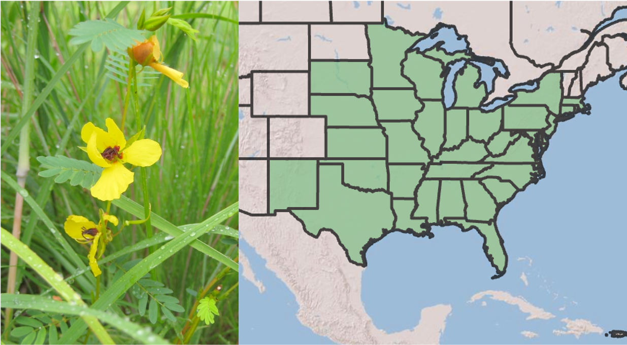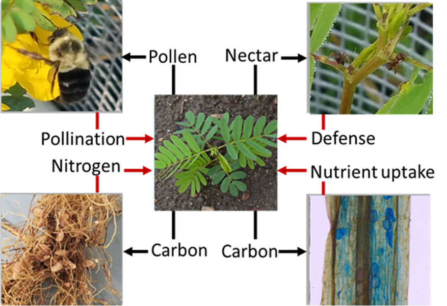 Chamaecrista fasciculata is an annual legume1 that is native to the Midwestern and Eastern United States often occurring in prairies, old fields, and disturbed sites (Fehling 2022 and references therein). The C. fasciculata mutualist system is ideal for studying multiple mutualist effects given the diversity and manipulability of its partners. While all partners receive a form of plant carbon, each benefits the plant with a unique nutrition, protection, or transportation reward. These partners further represent diversity in their (i) physical association (symbiotic vs non-symbiotic), (ii) degree of obligacy, and (iii) specificity to the focal species. Mycorrhizae provide increased uptake of nutrients (esp. phosphorous) and water provided to the plant, and generally have beneficial effects on plant fitness as their supply of nutrients supports increased plant growth. Rhizobia form nodules in the roots of plants where they fix nitrogen into a form usable by plants, and the degree of benefits provided to the plant can vary. C. fasciculata depends primarily on bees for pollen transfer but can self-pollinate at very low rates (references in Fehling (2022)).