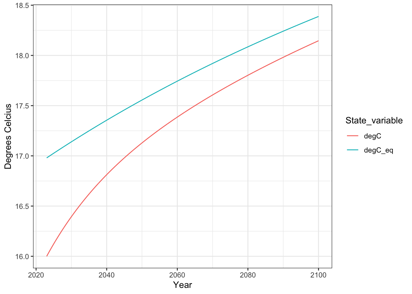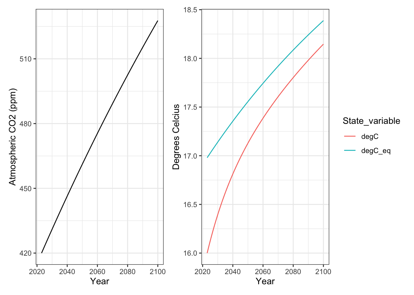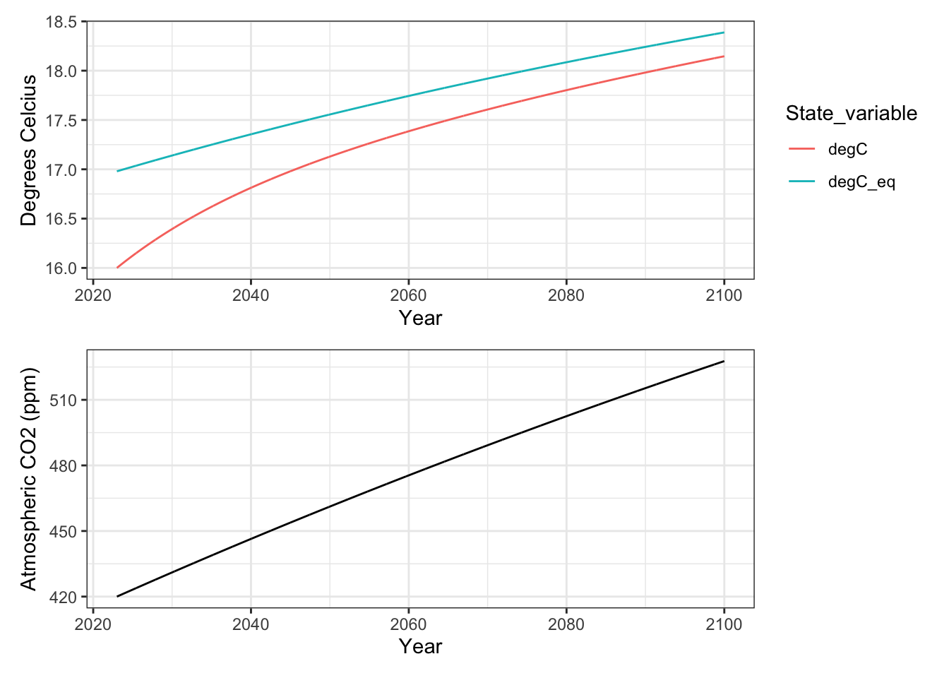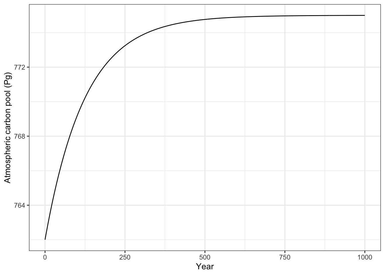 ## endNext, we tell R what parameters to use, and the initial amount of carbon in the atmosphere at time zero.