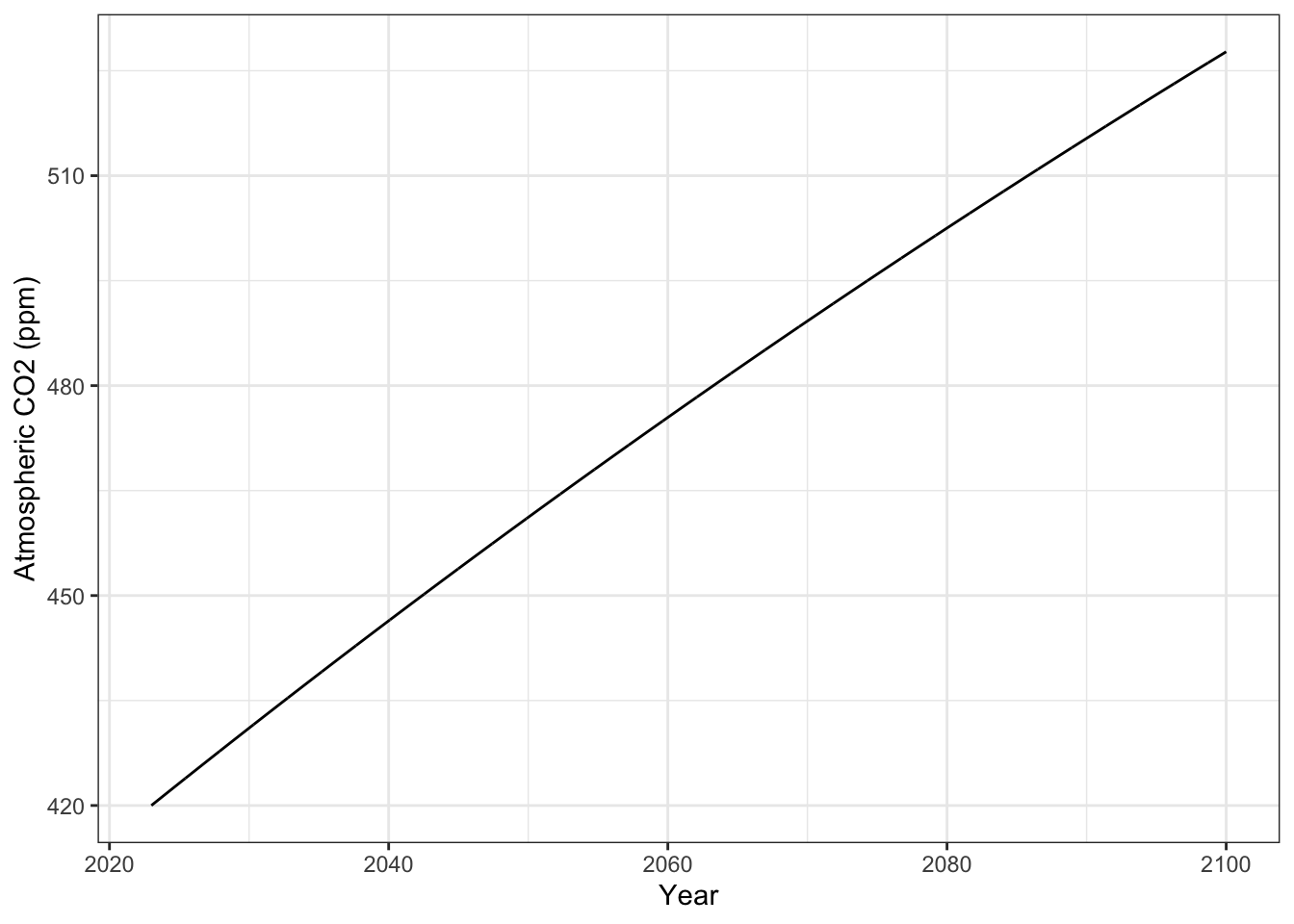 \[\mathrm{Atmosphere_{t}} = \mathrm{Atmosphere_{0}} + \mathrm{net~flux} + \mathrm{net~flux} + \ldots + \mathrm{net~flux}\] That is equivalent to multiplying the annual flux by the number of years, \(t\). \[\mathrm{Atmosphere_{t}} = \mathrm{Atmosphere_{0}} + \mathrm{net~flux}\cdot t\]