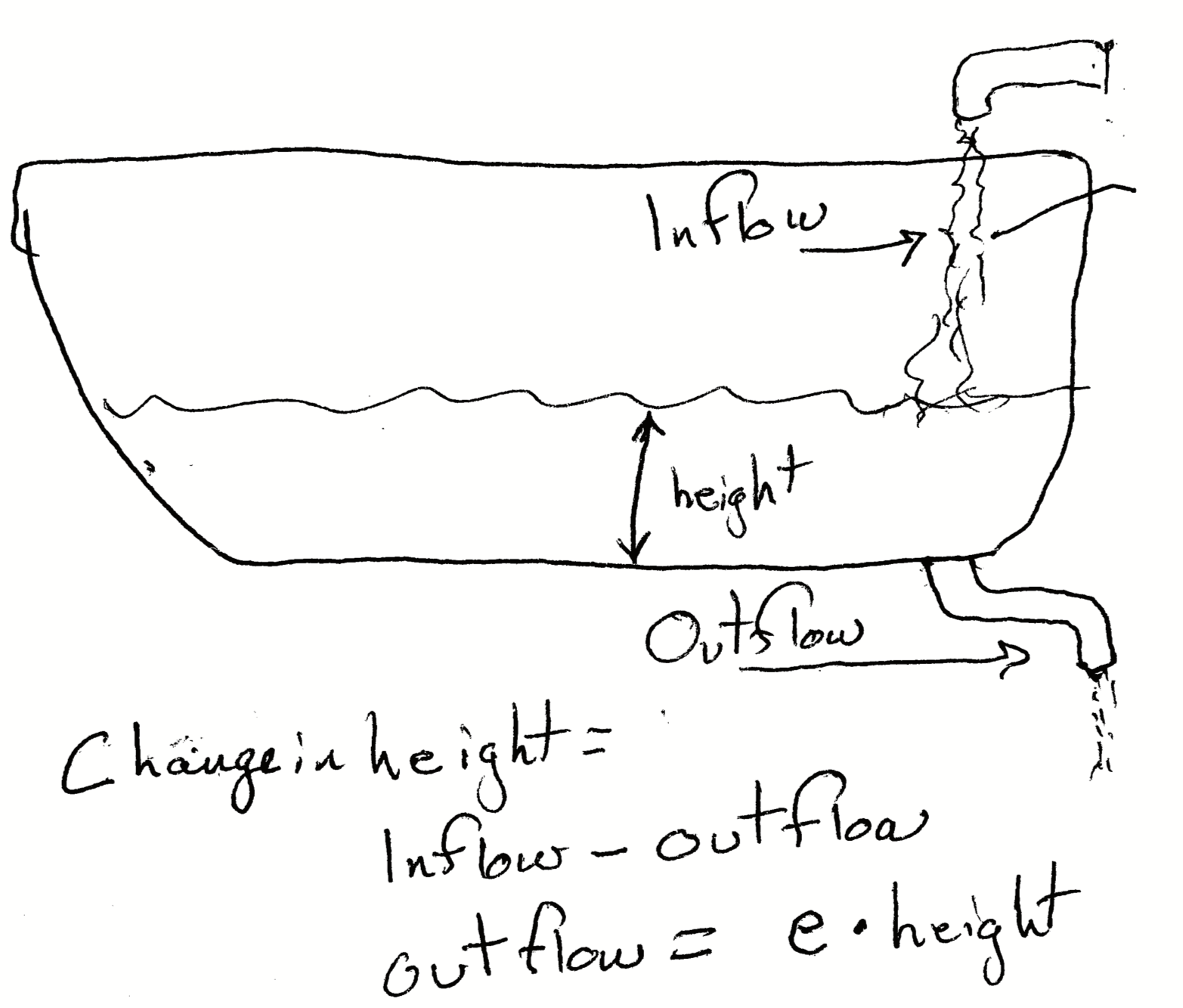 Imagine we have bathtub that we are filling with water, and that the drain has a leak. Just like with our simple budget above, rate of change in the depth (or height) of the water is \[\Delta \mathrm{height} = \mathrm{inflow} -\mathrm{outflow}.\]